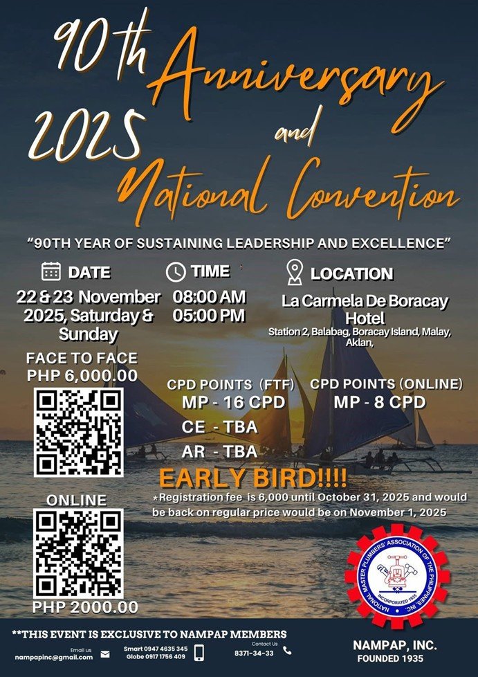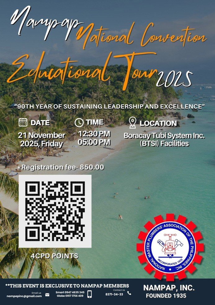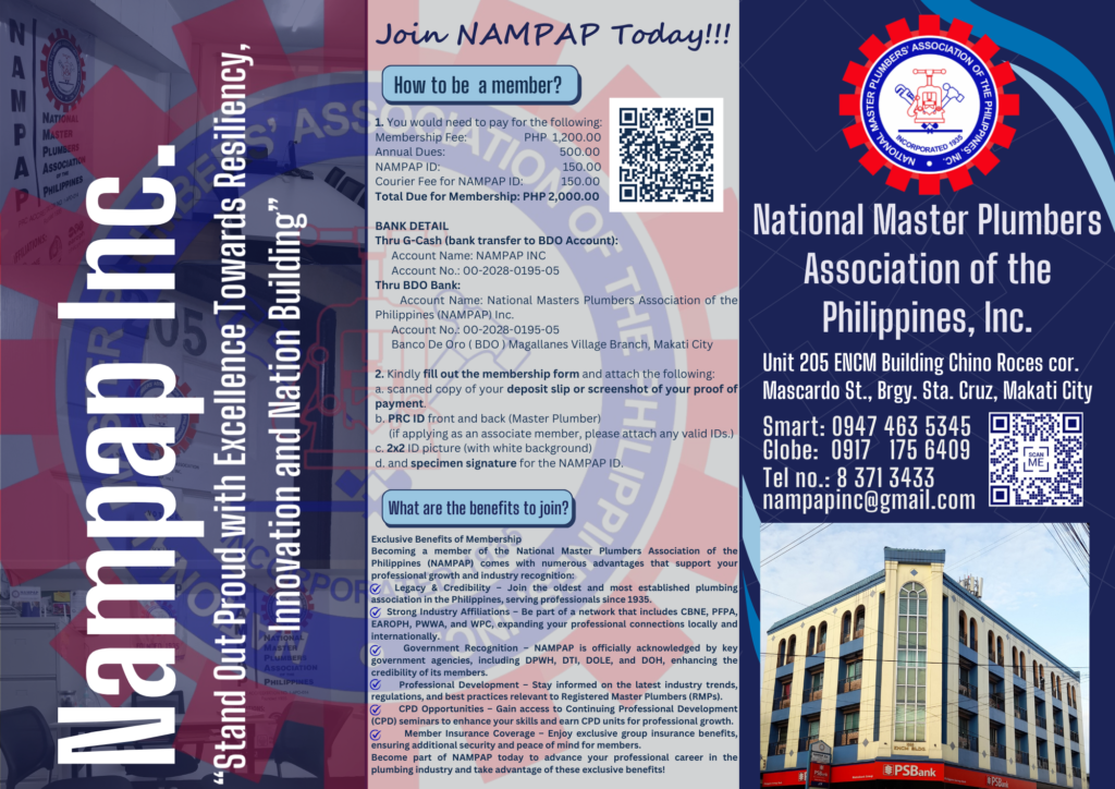 The National Master Plumbers Association of the Philippines (NAMPAP) is committed to uniting and empowering Registered and Licensed Master Plumbers by promoting professional excellence, lifelong learning, and ethical practices. We support our growth through partnerships and active member involvement, advocate for progressive plumbing laws, and embrace innovation and technology to address modern challenges. Guided by our Code of Ethics, we protect public health, safety, and the environment while enhancing the reputation of Master Plumbers as trusted partners in nation-building.